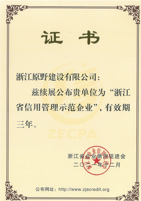 - 2018年12月,被評2018年度"浙江省信用管理示范企業(yè)"