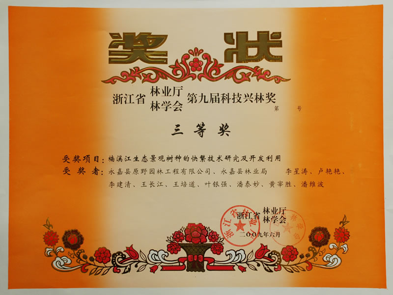浙江省林業(yè)廳林學(xué)會(huì)第九屆科技興林三等獎(jiǎng)