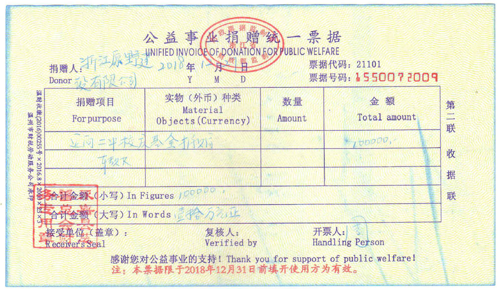 2018年向溫州市永嘉二中校慶基金會(huì)捐款十萬(wàn)元
