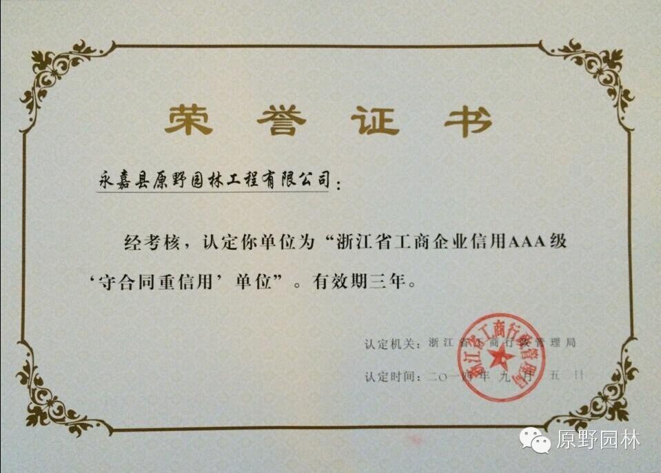 近日,喜報(bào)頻傳,原野連續(xù)獲得兩項(xiàng)榮譽(yù),第一項(xiàng)是浙江省工商行政管理局頒發(fā)的延續(xù)認(rèn)定我司為“浙江省工商企業(yè)信用AAA級(jí)守合同重信用”單位。多年來(lái),原野一直恪守誠(chéng)信經(jīng)營(yíng)作為企業(yè)立業(yè)之道,興業(yè)之本,構(gòu)筑企業(yè)誠(chéng)信管理體系,獲得廣大客戶好評(píng)。