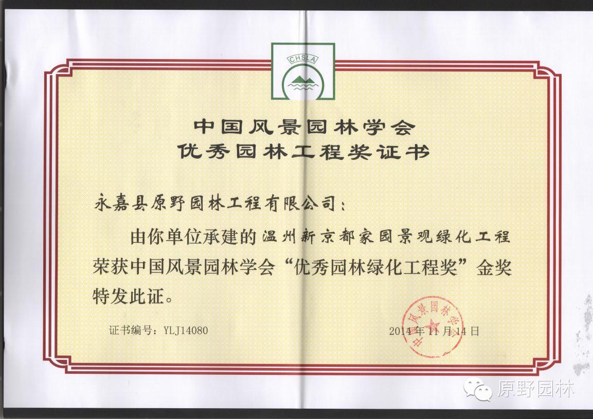 第二項(xiàng)是2012年9月24日通過(guò)竣工驗(yàn)收的溫州新京都家園景觀綠化工程獲得中國(guó)優(yōu)秀風(fēng)景園林工程金獎(jiǎng),此次國(guó)家級(jí)金獎(jiǎng)是原野繼常州世茂香檳湖景觀綠化工程項(xiàng)目之后的第二個(gè)國(guó)家級(jí)金獎(jiǎng),是溫州本土市場(chǎng)上獲得第一個(gè)國(guó)家級(jí)金獎(jiǎng),意義非凡,在此感謝公司項(xiàng)目部全體同仁的辛勤付出,以及公司其他部門(mén)的后勤支持。讓我們?cè)俳釉賲?,拿下更多的?guó)家乃至世界級(jí)的大獎(jiǎng)。