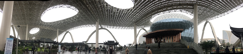 早上8:30,啟程前往杭州國(guó)際博覽中心參觀。自從G20杭州峰會(huì)后,杭州國(guó)際博覽中心就享譽(yù)世界,它擁有規(guī)劃建筑面積84萬(wàn)平方米,設(shè)有展示中心、會(huì)議中心、屋頂花園(城市客廳)、地下商業(yè)及車庫(kù)等五大功能區(qū)。由于目前只有部分功能區(qū)開放,考察團(tuán)一行從檢票口進(jìn)入直接上了二層,按照順序參觀了落客平臺(tái)、迎賓大廳、接待大廳,之后搭乘扶梯至四層的主會(huì)場(chǎng),然后再到五層的午宴區(qū)和屋頂花園。其中迎賓區(qū)讓人印象深刻,其門口有六對(duì)開放的“月亮門”,傳遞著“有朋自遠(yuǎn)方來(lái),不亦樂(lè)乎”的信息,廳內(nèi),我們發(fā)現(xiàn)了不少中國(guó)元素,比如四坡屋頂,兩側(cè)八根高大的立柱上裝飾的窗欞圖案。 最惹眼的是中間的大圓桌,直徑有30多米,頂部是三層淡藍(lán)色的絹燈,點(diǎn)綴著梅花和桂花圖案,外圈選用了最具中國(guó)符號(hào)的青花瓷。