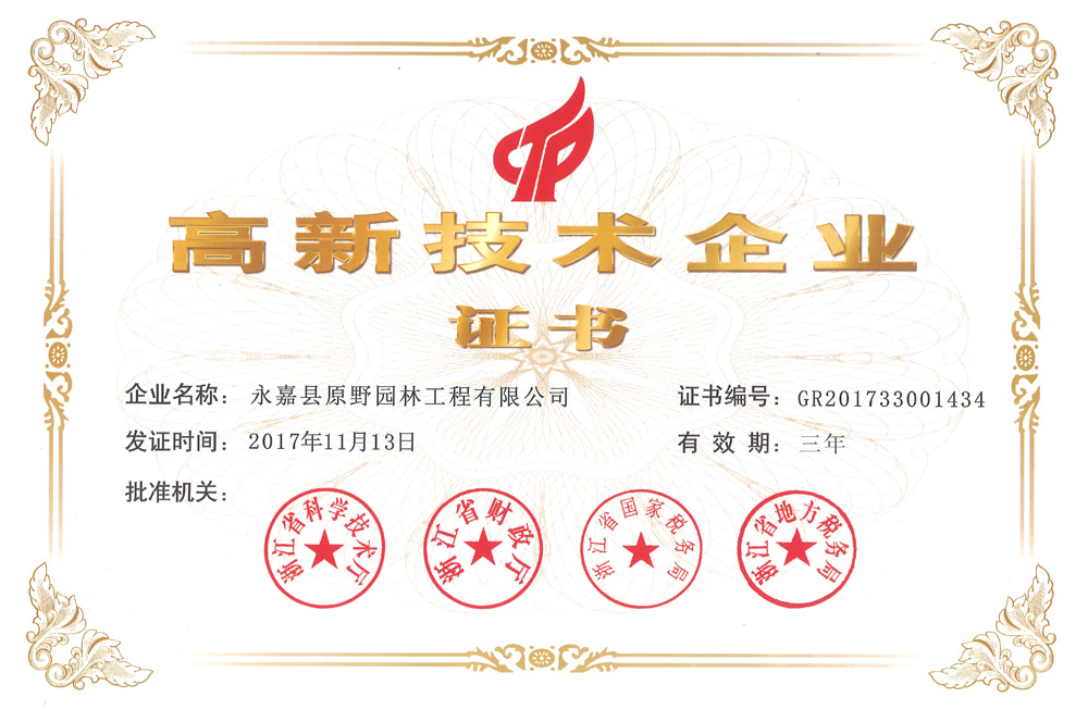 獲得國家高新技術企業(yè)稱號,是原野園林取得進步的一個里程碑。今后,原野園林將繼續(xù)引進人才團隊,更加注重自主創(chuàng)新、加大科研投入,加強技術創(chuàng)新能力以及科技成果轉化能力,在科研及技術的道路上銳意進取,始終保持企業(yè)的創(chuàng)新水平,努力走在高新技術行業(yè)的前列。