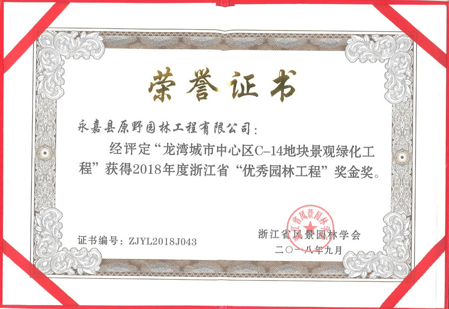 2018-12-3012月21日,浙江省第八屆“園林人居”論壇暨2018年“優(yōu)秀園林工程”獎頒獎大會在杭州舉行。原野建設(shè)承建的“龍灣城市中心區(qū)c-14地塊工程”(以下簡稱C14)、“梧田E10地塊景觀綠化工程”(以下簡稱E10)、“永嘉縣行政中心建設(shè)工程景觀綠化工程”(以下簡稱行政中心建設(shè))三個項目分別獲得2018年度浙江省“優(yōu)秀園林工程獎”金獎。