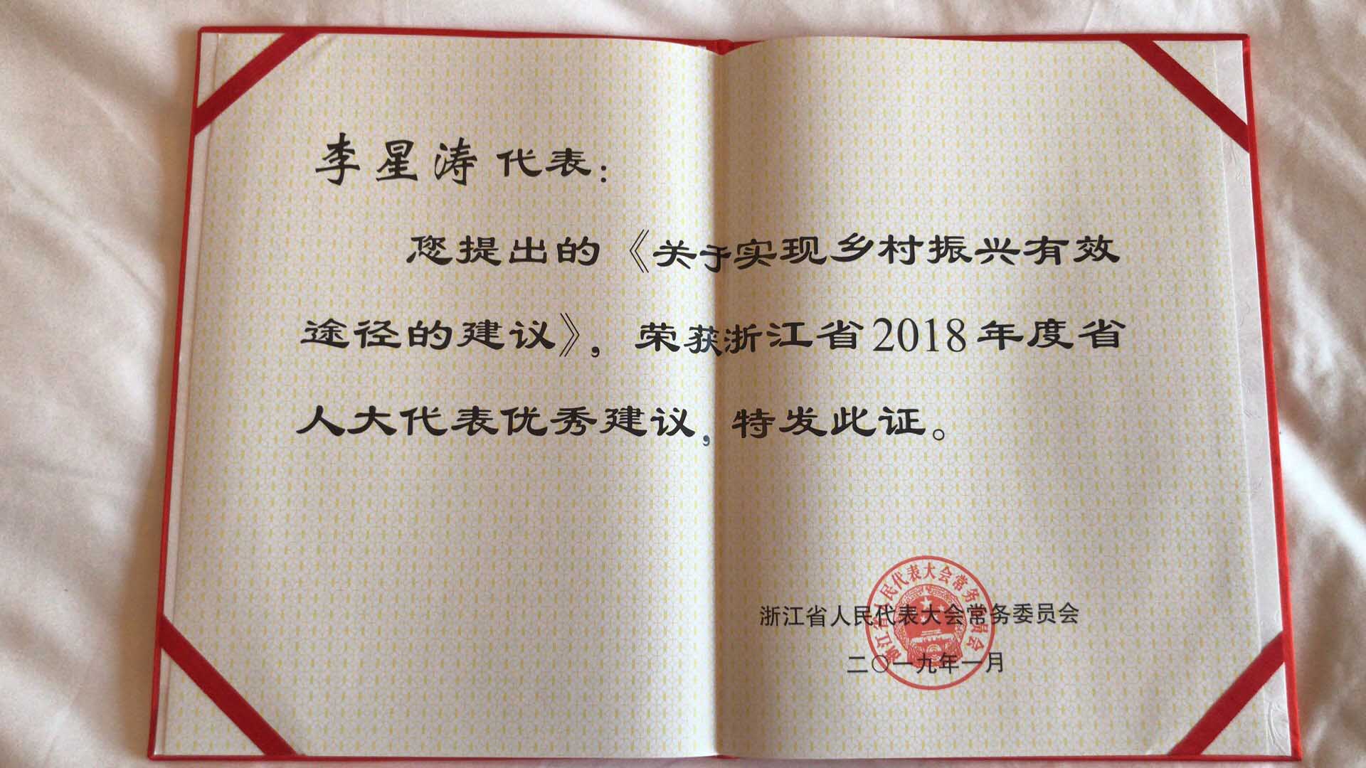 李星濤榮獲2018年度省人大代表優(yōu)秀建議