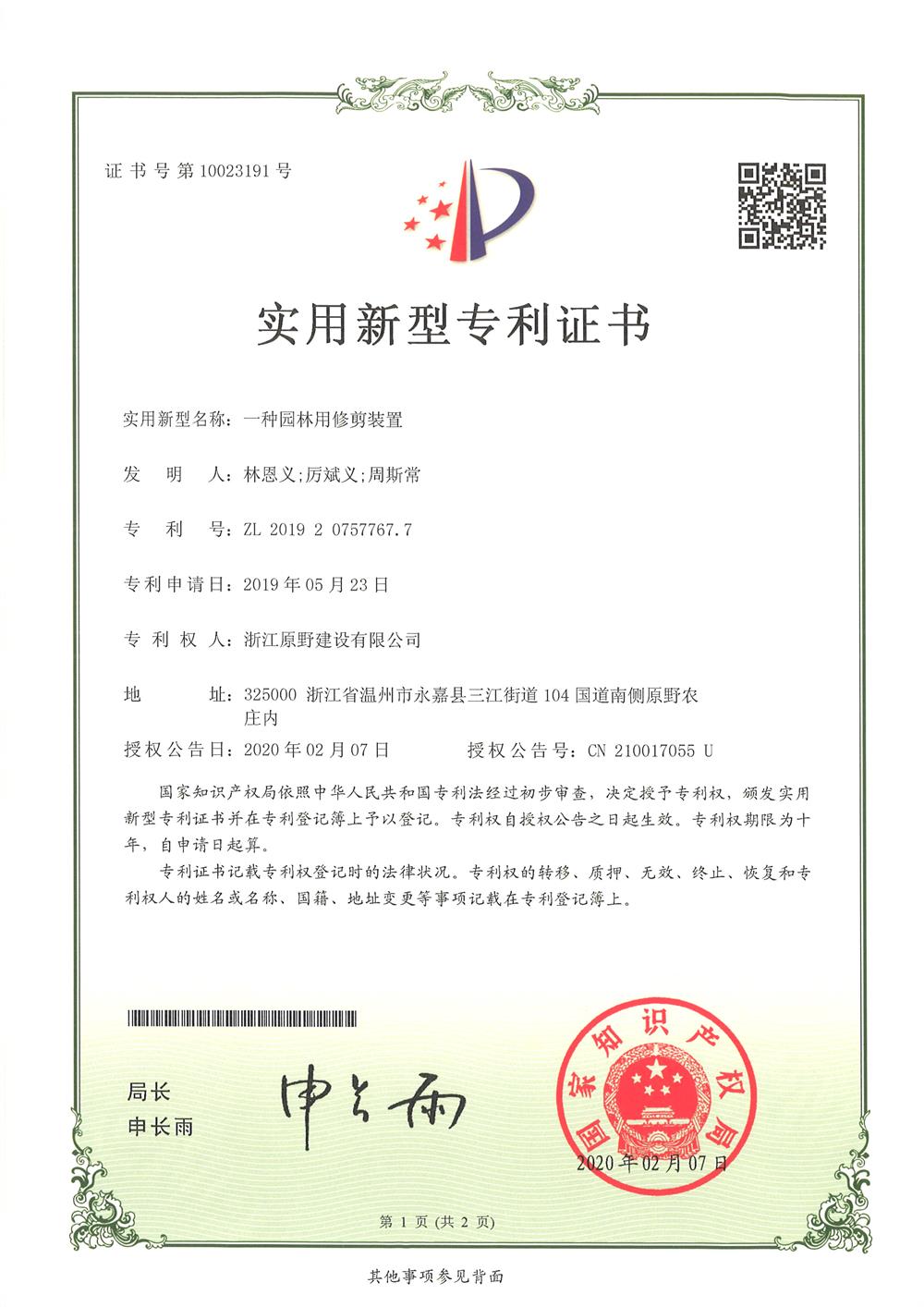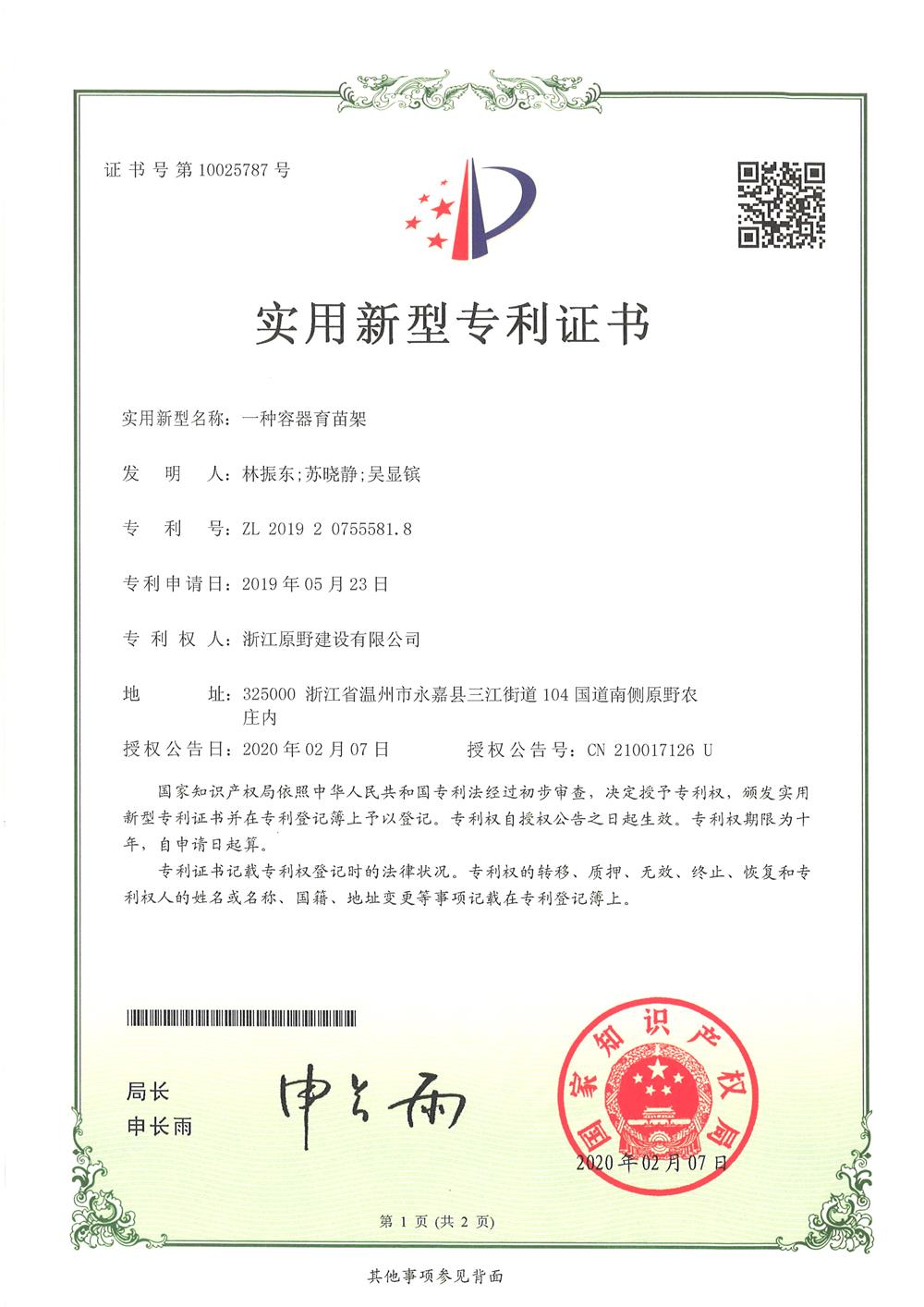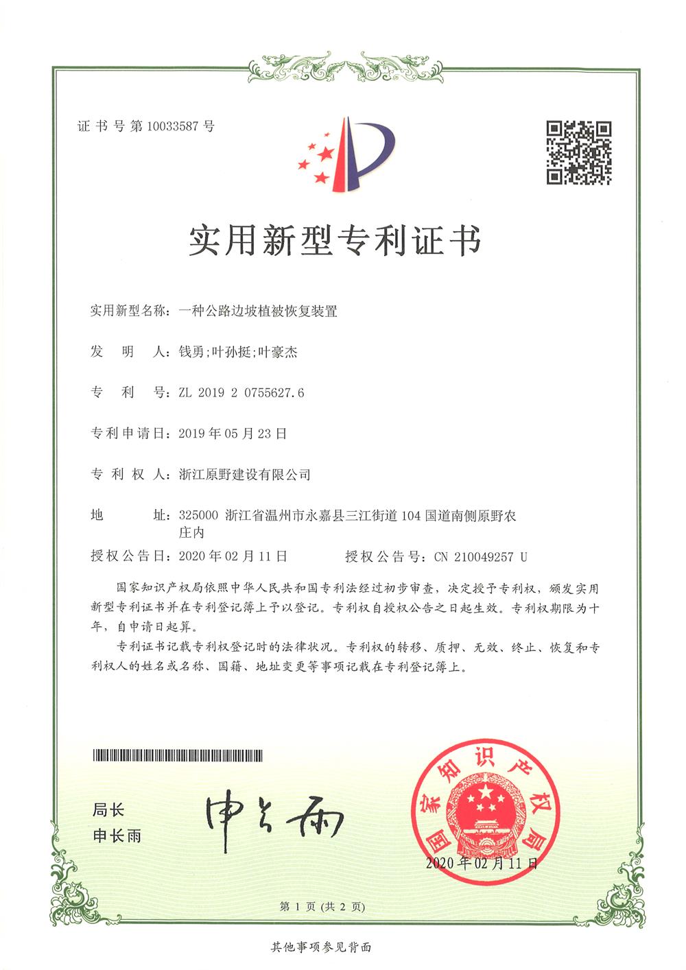 今日,原野集團(tuán)收到實(shí)用新型專利證書(shū)。專利名稱為一種公路邊坡植被恢復(fù)裝置、一種林區(qū)土壤數(shù)據(jù)采集裝置、 一種容器育苗架、一種園林用修剪裝置、一種植物水培育裝置5項(xiàng)專利。