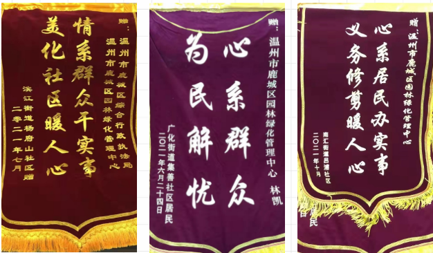 近日,鹿城區(qū)楊府山社區(qū)、集善社區(qū)、呂浦社區(qū)給鹿城區(qū)綜合行政執(zhí)法局與園林綠化管理中心送去錦旗。這是社區(qū)居民對(duì)綜合行政執(zhí)法局與園林綠化管理中心五個(gè)多月來的貼心服務(wù),所表達(dá)的感謝與肯定。