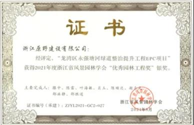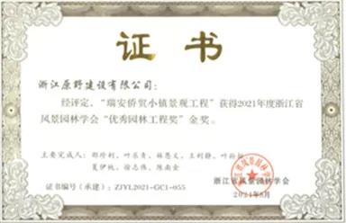 2022-01-25日前,浙江原野建設(shè)有限公司收到浙江省風(fēng)景園林學(xué)會頒發(fā)的優(yōu)秀園林工程獎證書。