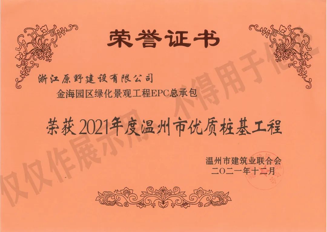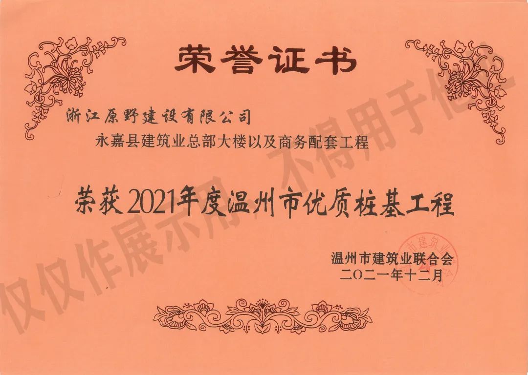近日,浙江原野建設(shè)有限公司收到溫州市建筑業(yè)聯(lián)合會(huì)頒發(fā)的證書。公司兩項(xiàng)工程榮獲2021年度溫州市優(yōu)質(zhì)樁基工程榮譽(yù)。