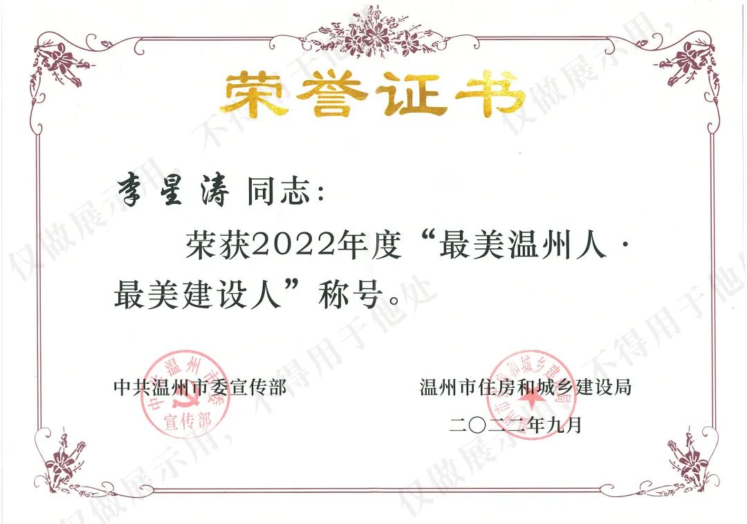 2023年1月6日,溫州市住房和城鄉(xiāng)建設(shè)局在市圖書館舉辦“最美溫州人·最美建設(shè)人”頒獎儀式。浙江原野建設(shè)有限公司董事長李星濤榮獲2022年度“最美溫州人·最美建設(shè)人”稱號。