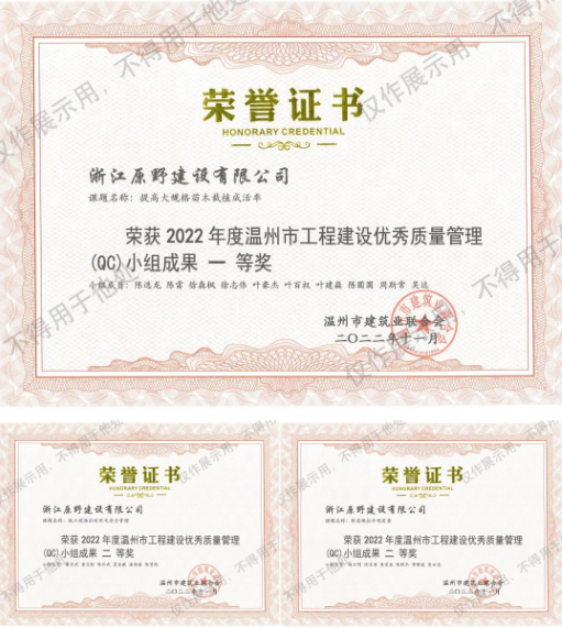 2023-04-21日前,溫州市建筑業(yè)聯(lián)合會(huì)組織召開2023年溫州市工程建設(shè)QC成果交流學(xué)習(xí)會(huì),浙江原野建設(shè)有限公司共獲得7個(gè)獎(jiǎng)項(xiàng)。