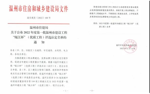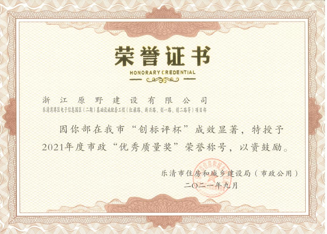 2023-10-1610月16日,根據(jù)溫市政業(yè)[2023]1號文件《溫州市市政行業(yè)“一先一優(yōu)”申報的通知》和溫市政業(yè)[2012]14號文件《溫州市市政行業(yè)先進單位評選辦法》、溫市政業(yè)[2012]18號文件《溫州市市政工程優(yōu)秀項目經(jīng)理評選辦法》的規(guī)定,經(jīng)各單位申報、各區(qū)縣住建局或市政園林局推薦,市市政行業(yè)協(xié)會秘書處組織對申報材料初審、評審小組綜合評議、無記名投票和公示等程序,“浙江原野建設(shè)有限公司”被評為“2022年度溫州市市政行業(yè)先進單位”。擔(dān)任樂清灣港區(qū)電子信息園區(qū)(二期)基礎(chǔ)設(shè)施配套工程項目經(jīng)理的楊衛(wèi)明,被評為“2022年度溫州市市政工程優(yōu)秀項目經(jīng)理”。