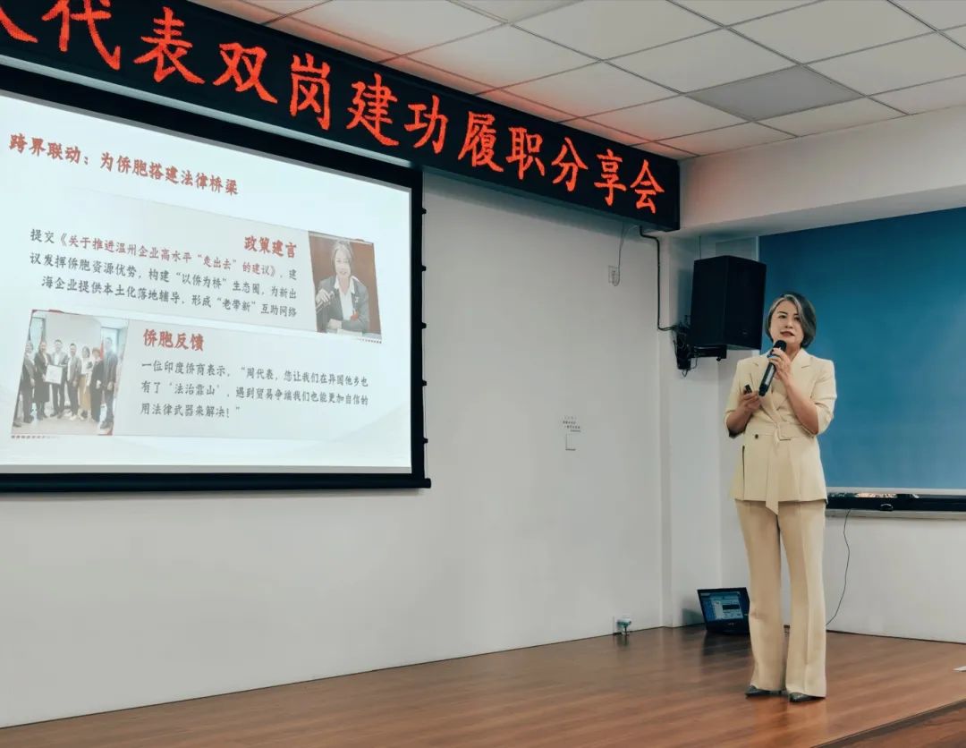 律師代表周春萍以“初心、使命、共振”為核心,分享其”雙崗建功”履職實(shí)踐。律師執(zhí)業(yè)25年的她以個(gè)案傳遞法治溫度,如代理抑郁癥婦女離案時(shí),不僅爭取撫養(yǎng)費(fèi),還協(xié)助辦理低保和殘疾補(bǔ)助,讓當(dāng)事人感慨“法律是公平而溫暖的”。當(dāng)選代表后,她將“個(gè)案正義“升華為“制度正義”,針對(duì)“落戶難”兒童撰寫《行政審批服務(wù)“深水區(qū)"改革建議》,推動(dòng)政策破冰;提交《光污染防治建議》促成溫州首部光污染法規(guī)出臺(tái),明確玻璃幕墻反光標(biāo)準(zhǔn),惠及32個(gè)小區(qū)5萬居民。她發(fā)揮“律師+代表"雙重優(yōu)勢(shì),參與洞頭“海上花園”立法,吸納80余條群眾建議,推動(dòng)海域確權(quán)登記制度落地;聯(lián)合百家律所成立“千百會(huì)”法律服務(wù)團(tuán),為68萬海外僑胞提供跨境維權(quán)支持,挽回經(jīng)濟(jì)損失超2億元,被僑胞譽(yù)為“法治護(hù)身符”。以專業(yè)力量破解民生難題,以制度建言推動(dòng)法治進(jìn)步,實(shí)現(xiàn)“個(gè)案解民憂、立法惠民生、跨界促共治”,彰顯人大代表”雙崗建功”的示范價(jià)值。