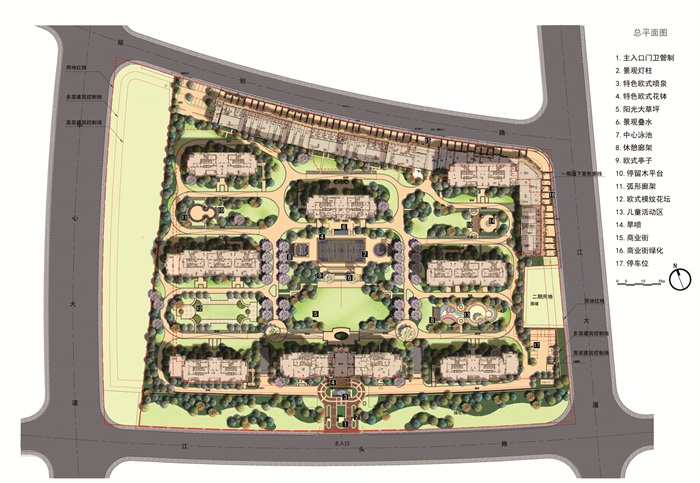 設(shè)計(jì)結(jié)合本案所建成的建筑風(fēng)格及使用需求,以建設(shè)“輕奢、高尚”的精致安置小區(qū)為理念,塑造“輕奢華、新時尚”的生活形態(tài)。整體設(shè)計(jì)分為五大點(diǎn):一大景觀軸線、兩條交通系統(tǒng),三進(jìn)景觀庭院、四大主題游園,五重回家禮序。觀軸線、兩條交通系統(tǒng),三進(jìn)景觀庭院、四大主題游園,五重回家禮序。