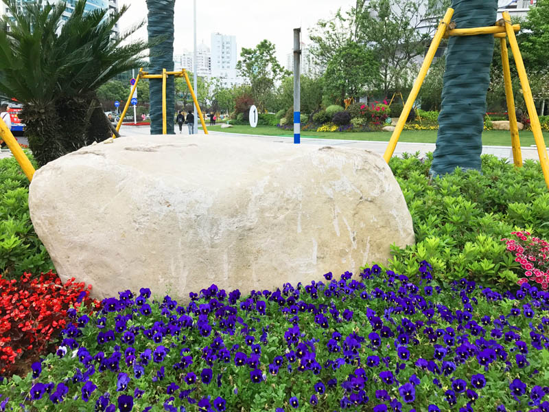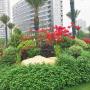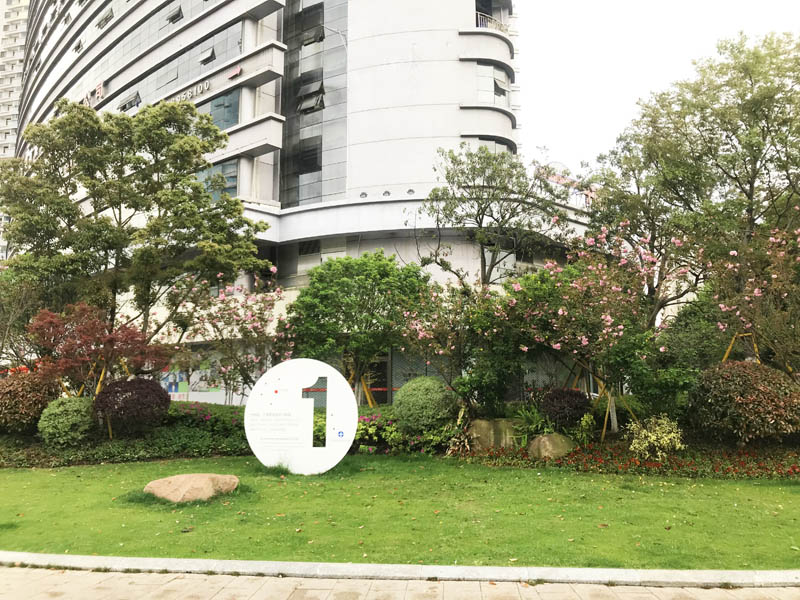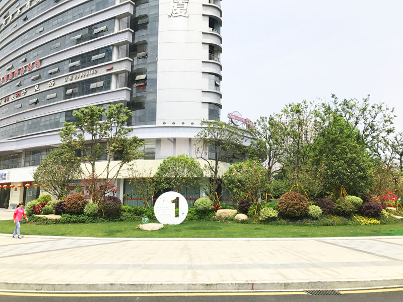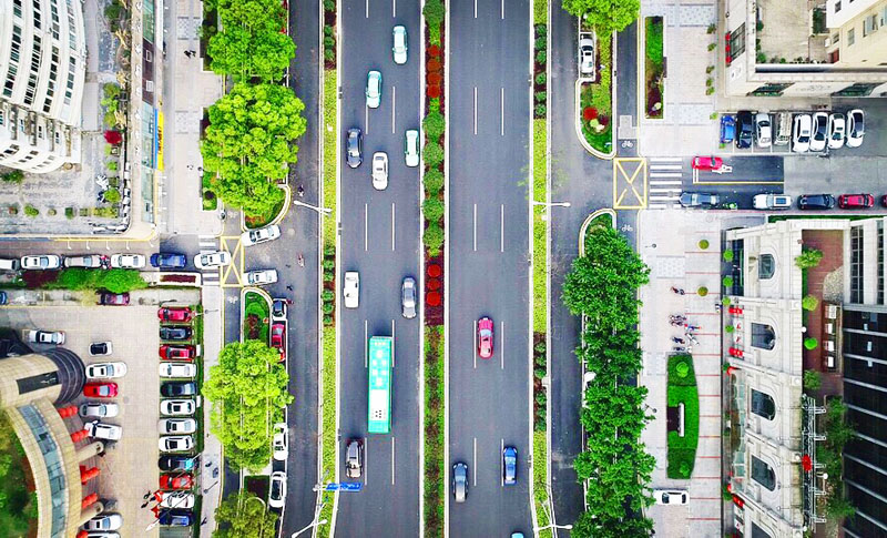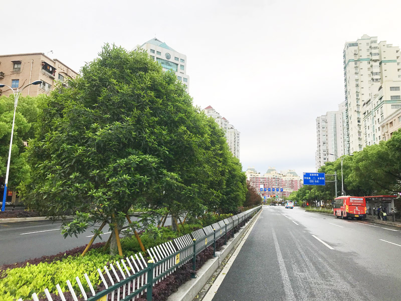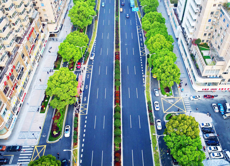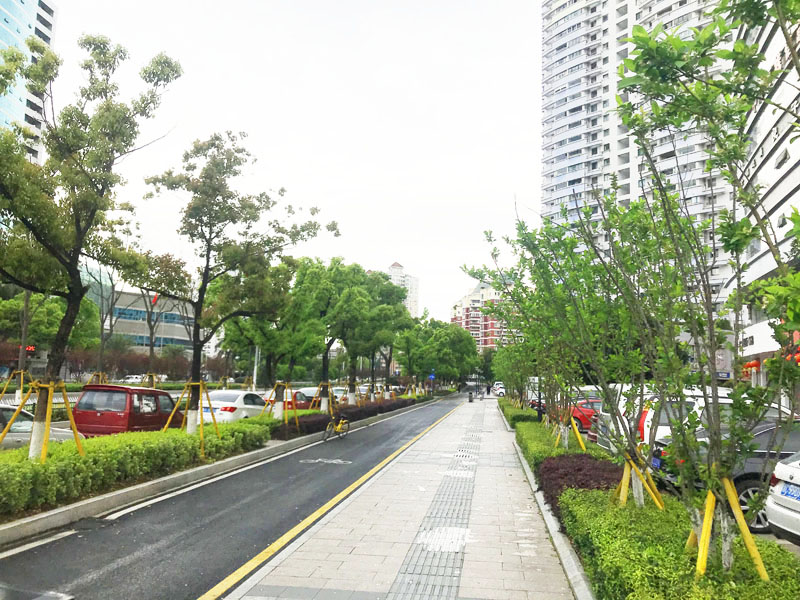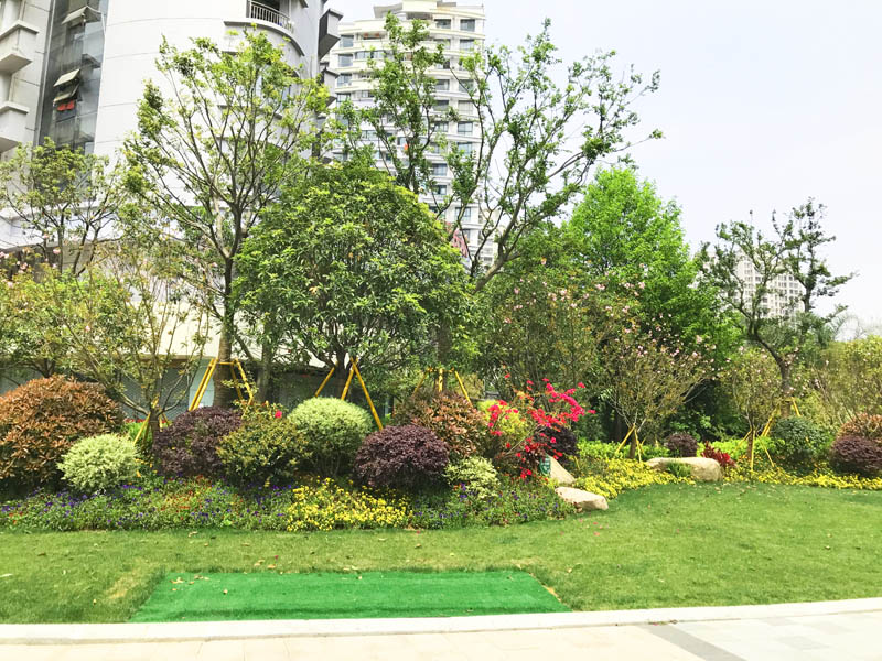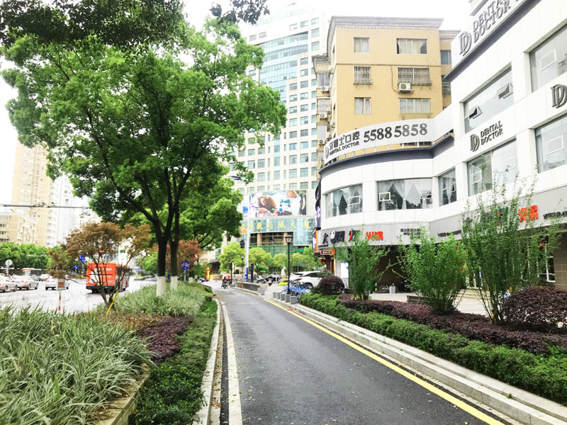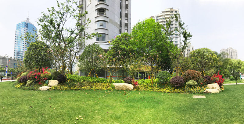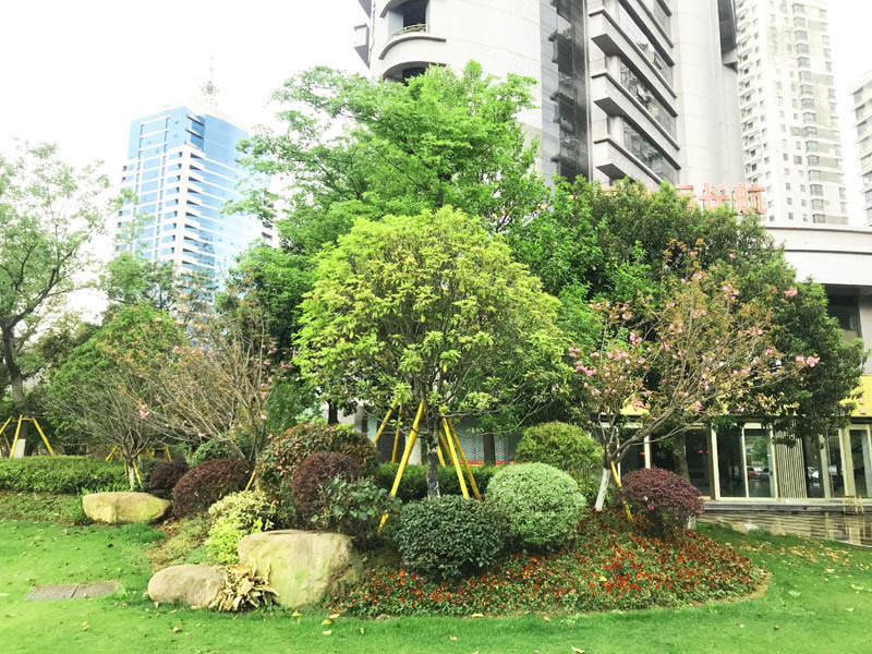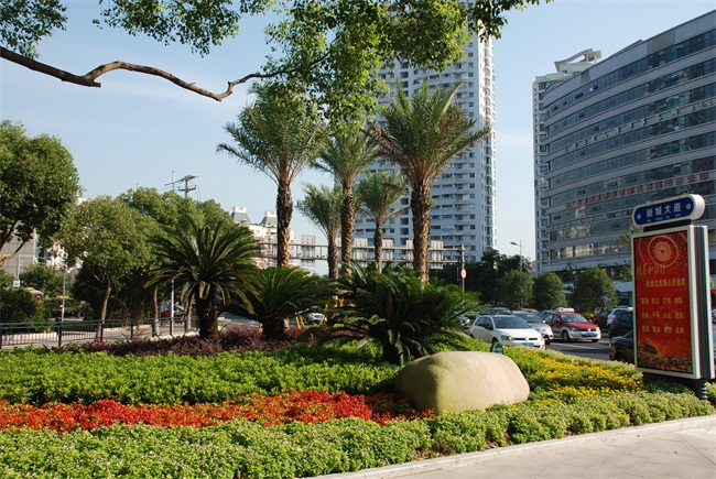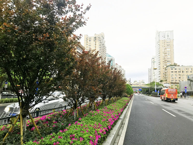 新城大道道路清潔,五條綠化隔離帶清晰明了,原有保留的大香樟蒼蔥濃郁,新種綠化帶秀美而富有色彩變化,形成鮮明對(duì)比。道路景觀節(jié)點(diǎn)上骨架大喬木有樸樹、杜英、含笑,中間層有桂花、櫻花,下層各種球類植物及三角梅,底層色帶苗及時(shí)令花卉,前面留出大面積草坪,結(jié)構(gòu)清晰,色帶豐富。
