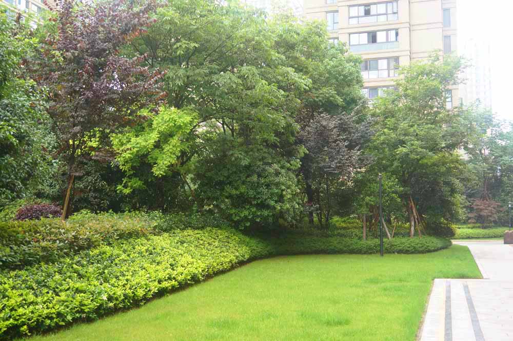 項(xiàng)目建筑的外立面呈米黃色,綠化設(shè)計(jì)品種多樣,季相變化豐富。施工方花了大量的時(shí)間尋找苗源,確定每個(gè)組團(tuán)的骨干苗木,再根據(jù)每個(gè)組團(tuán)骨干苗木品種規(guī)格數(shù)量來選購,使整個(gè)小區(qū)一步一景,步移景異,植物季相色彩變化豐富,給人以生活在原生態(tài)大自然中的感覺。